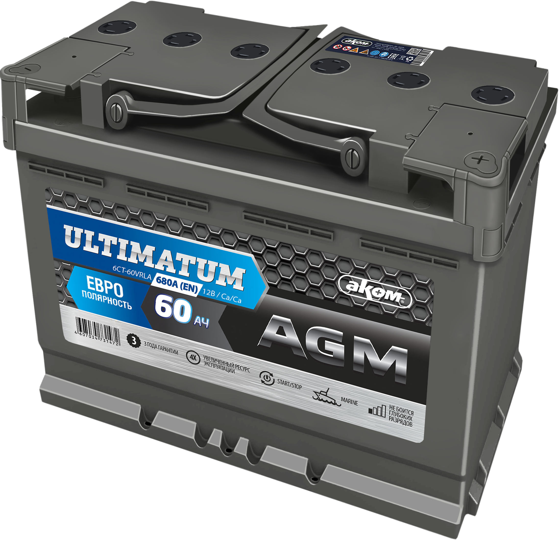АКБ 6СТ-60.0VRLA ULTIMATUM AGM Euro (L2, пуск. ток 680, плюс справа, гарантия 24 месяца)