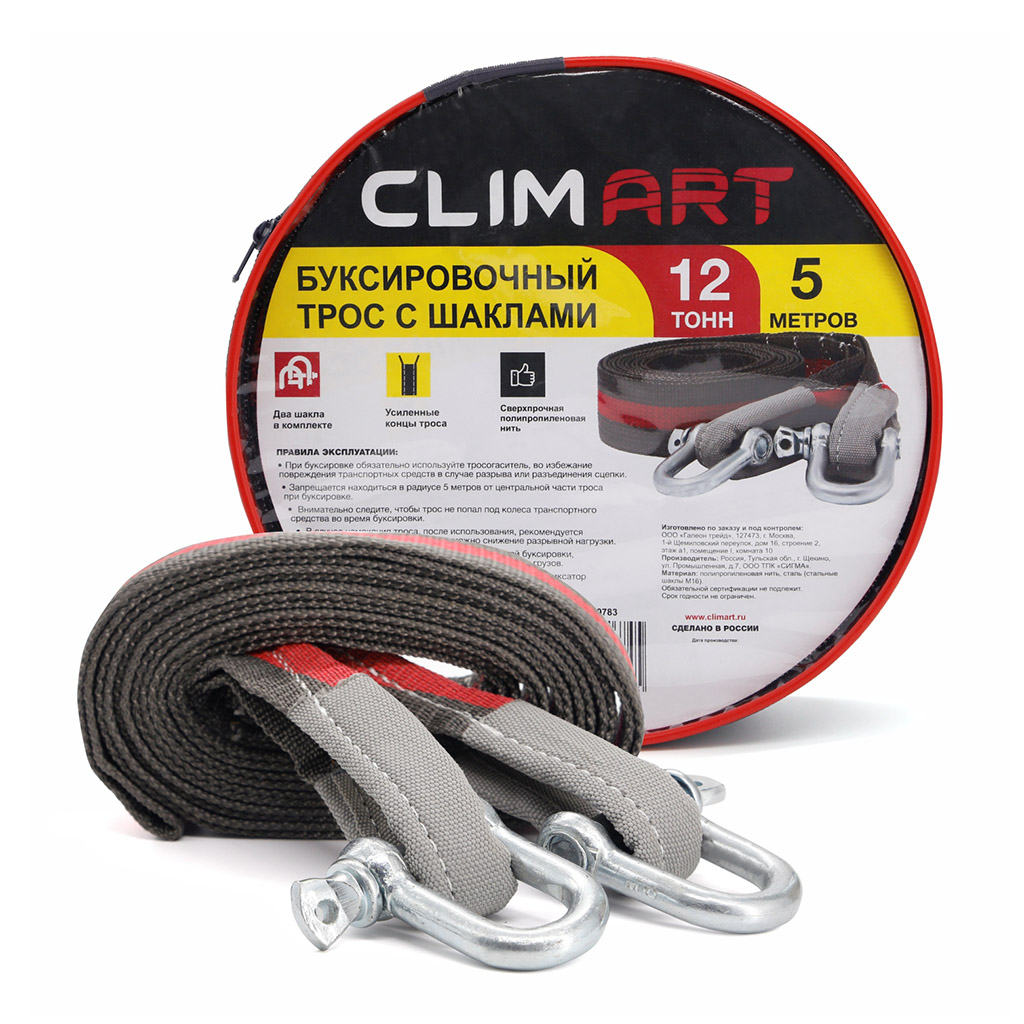 Трос для буксировки Clim Art имеет разрывную нагрузку 12 тонн и предназначен только для буксировки транспортных средств со снаряженной массой до 6 тонн, поэтому он подходит для буксировки как легковых автомобилей, так кроссоверов и внедорожников. Он станет незаменимым помощником водителя в условиях бездорожья и в аварийных ситуациях.