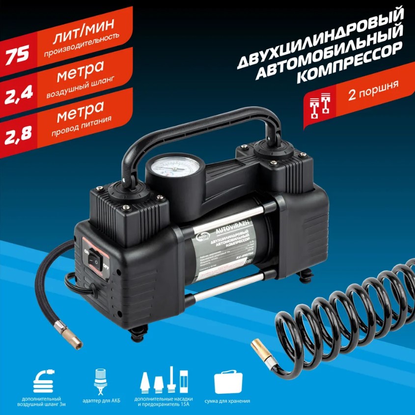 Отзывы о «Компрессор двухцилиндровый 75 л/мин с манометром, пневматический спиральный шланг "AUTOVIRAZH" AV-010750»