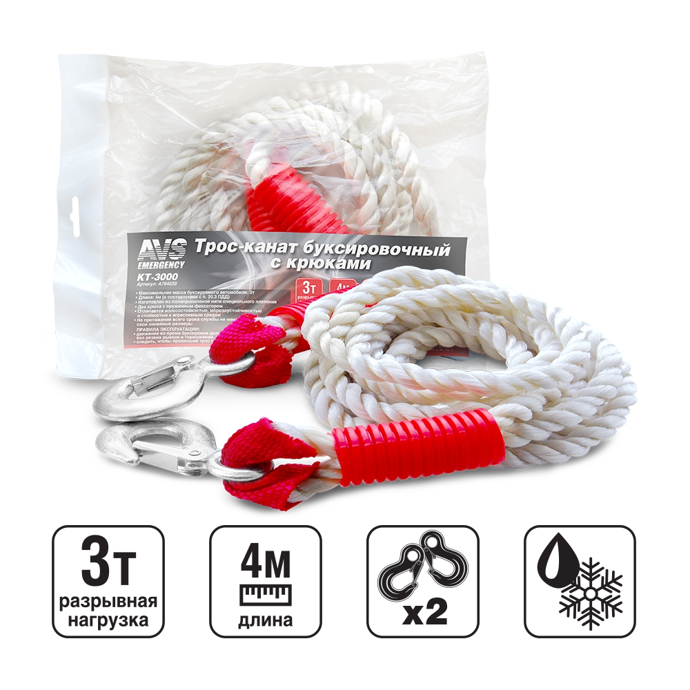Характеристики «Трос-канат буксировочный с крюками AVS KT-3000 3т 4м, в пакете»