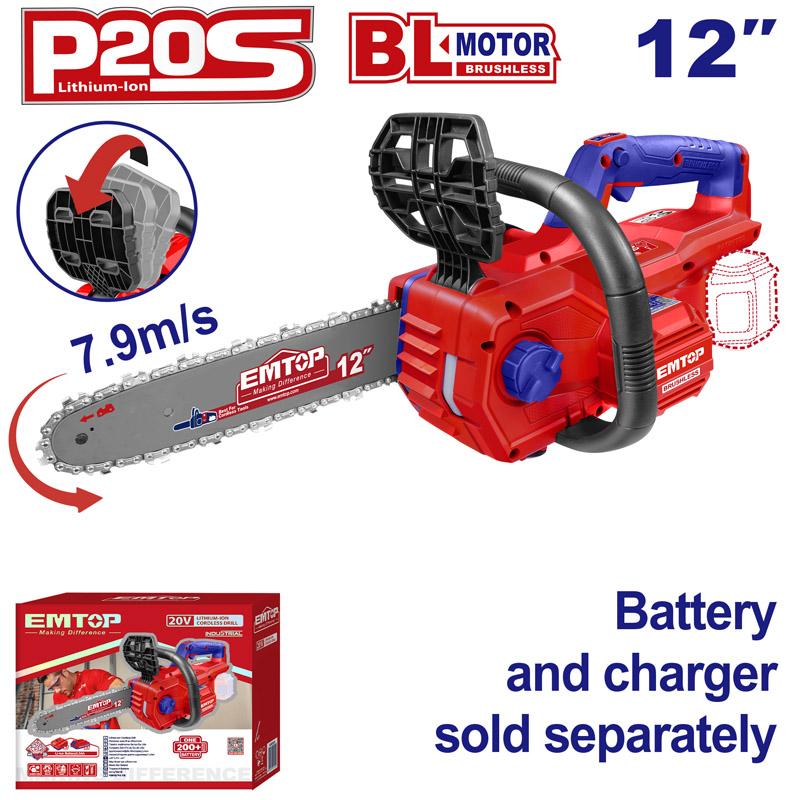 Аккумуляторная цепная пила Бесщеточный двигатель Скорость вращения цепи: 7,9 м/с Длина стержня: 12 дюймов (30 см)