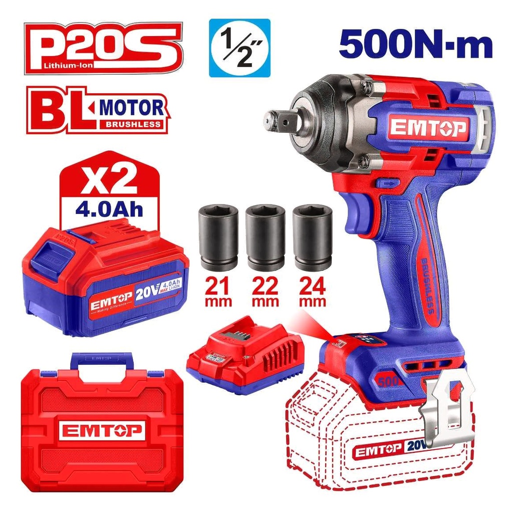 Аккумуляторный ударный гайковерт EMTOP, 500 Нм