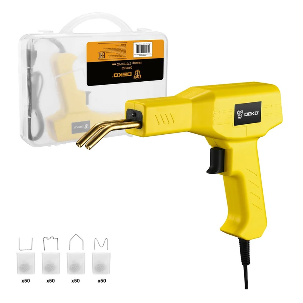 Паяльник для пластика DEKO DKWG50 предназначен для пайки, устранения трещин, разрывов, разломов, ремонта различных пластиковых деталей и других изделий из пластика. Скобы разогреваются за несколько секунд. Максимальная температура нагрева: 110℃, время нагрева: 5 сек, входной ток: 0,5А,