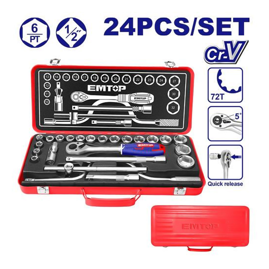 Набор торцевых головок с трещоткой 1/2" EMTOP ESKT12243 - комплект инструментов для ремонта и обслуживания автомобилей и прочей техники.