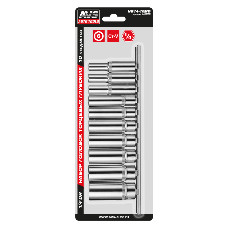 Характеристики «Набор головок торцевых 1/4"DR (4-13 мм) (10 предметов) глубокие на держателе AVS NG14-10MD»