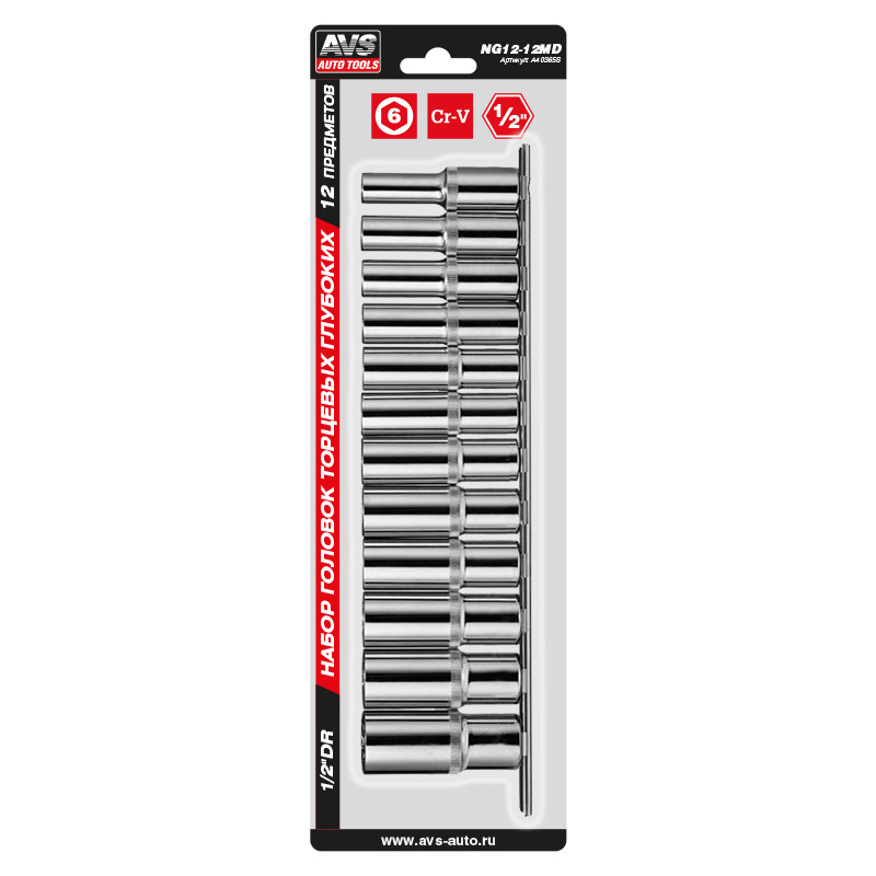 Характеристики «Набор головок торцевых 1/2"DR (10-24 мм) (12 предметов) глубокие на держателе AVS NG12-12MD»