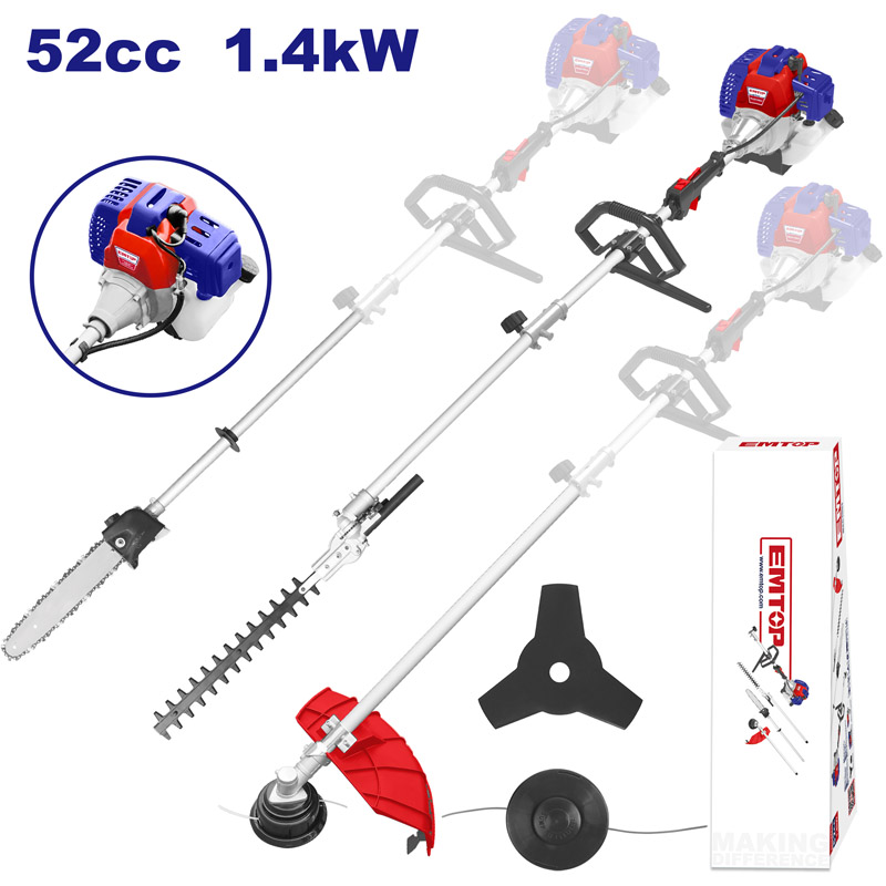 Многофункциональный бензотриммер Объем: 52 куб.см Номинальная мощность: 1,4 кВт (2,2 л.с.) Максимальная скорость вращения: 10000 об/мин