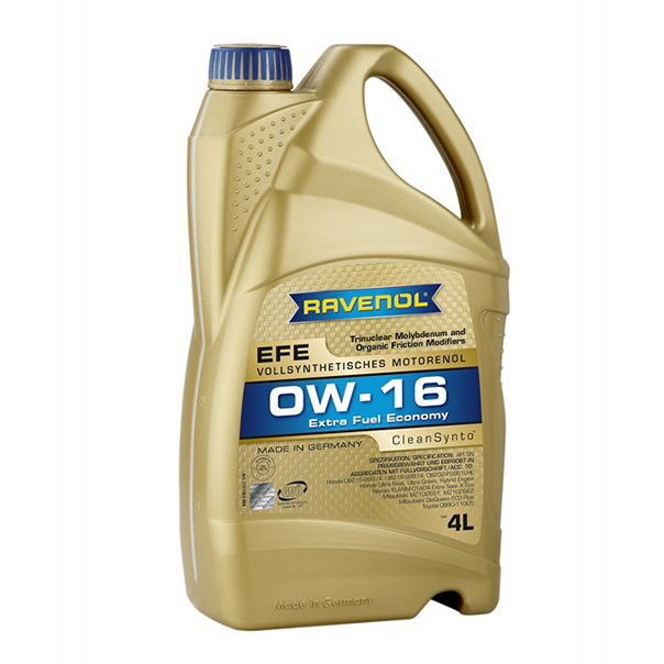 RAVENOL Extra Fuel Economy EFE 0W-16 особенно рекомендуется для гибридных двигателей. Разработано на основе трехядерного молибдена с применением органических модификаторов трения OFM (Organic Friction Modifiers), что позволяет снизить трение, износ и сократить расход топлива, также обеспечивает прекрасные свойства при «холодном» пуске.