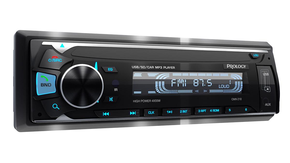 PROLOGY CMX-210 — FM SD/USB ресивер с Bluetooth, это автомагнитола стандартного размера 1DIN, которая обеспечивает прием радиостанций в диапазоне FM, воспроизведение медиафайлов, записанных на карты памяти USB / microSD, передачу звука с внешних источников, а также управление мобильным телефоном через интерфейс Bluetooth (ver. 4,2). Кроме того, устройством можно управлять с помощью приложения, установленного на Ваш смартфон с операционной системой Android.*