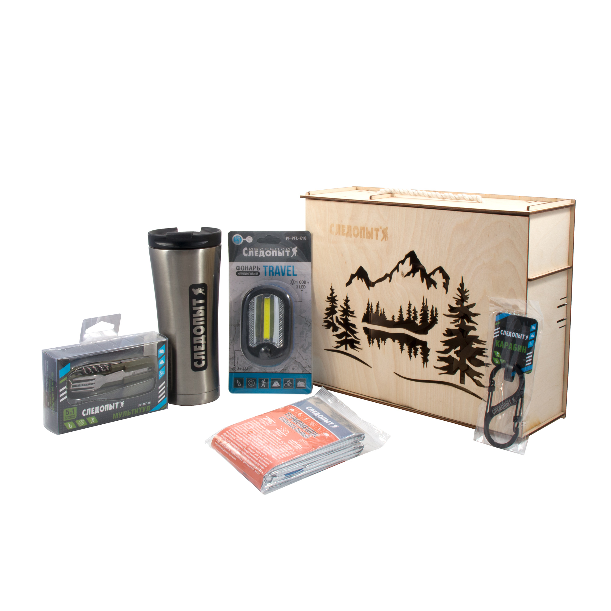 Подарочный набор "СЛЕДОПЫТ - Перевал" (коробка фанерная, термомешок, термокружка, мультитул, фонарь,