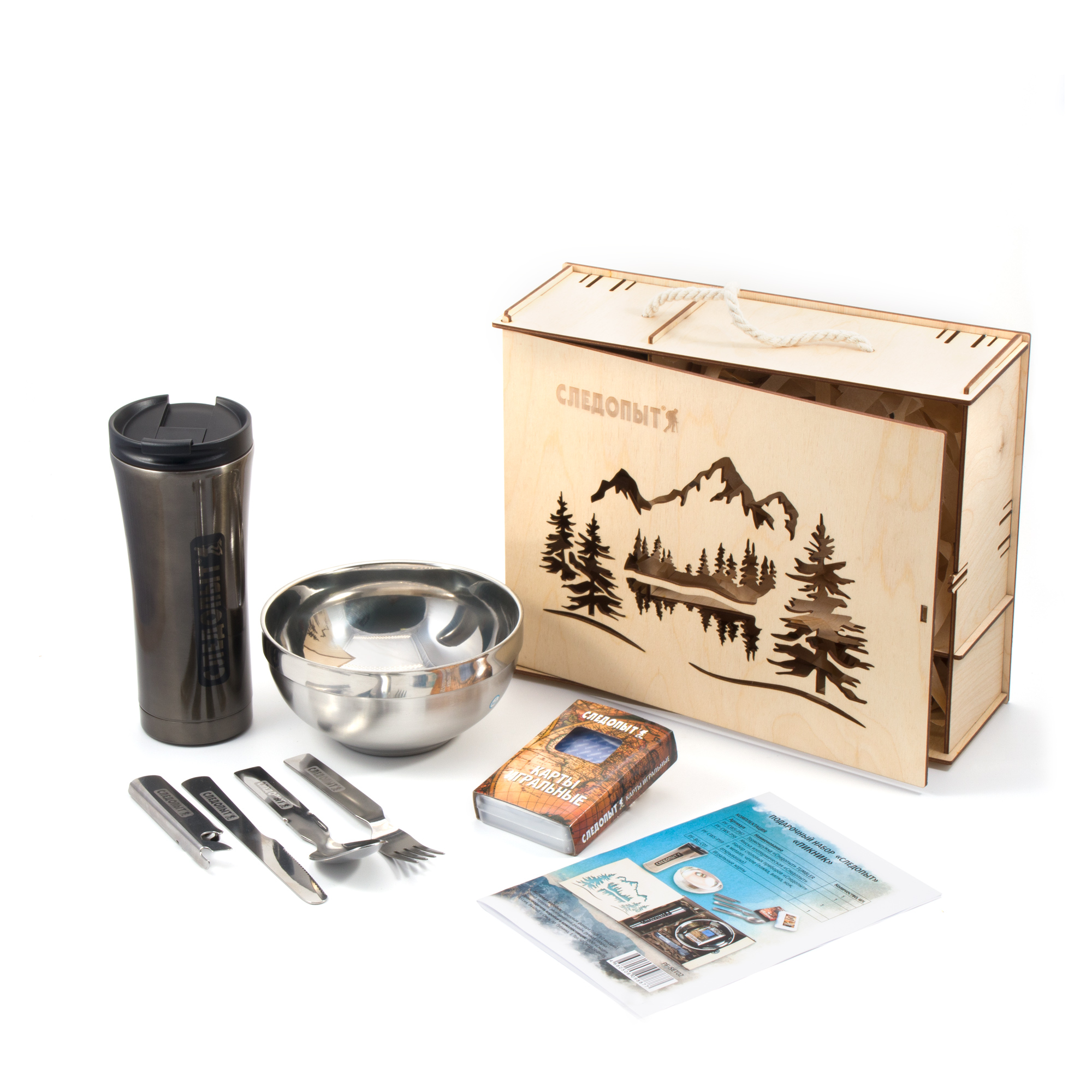 Подарочный набор "СЛЕДОПЫТ - Пикник" (коробка фанерная, термокружка, миска, столовые приборы, играль (****)