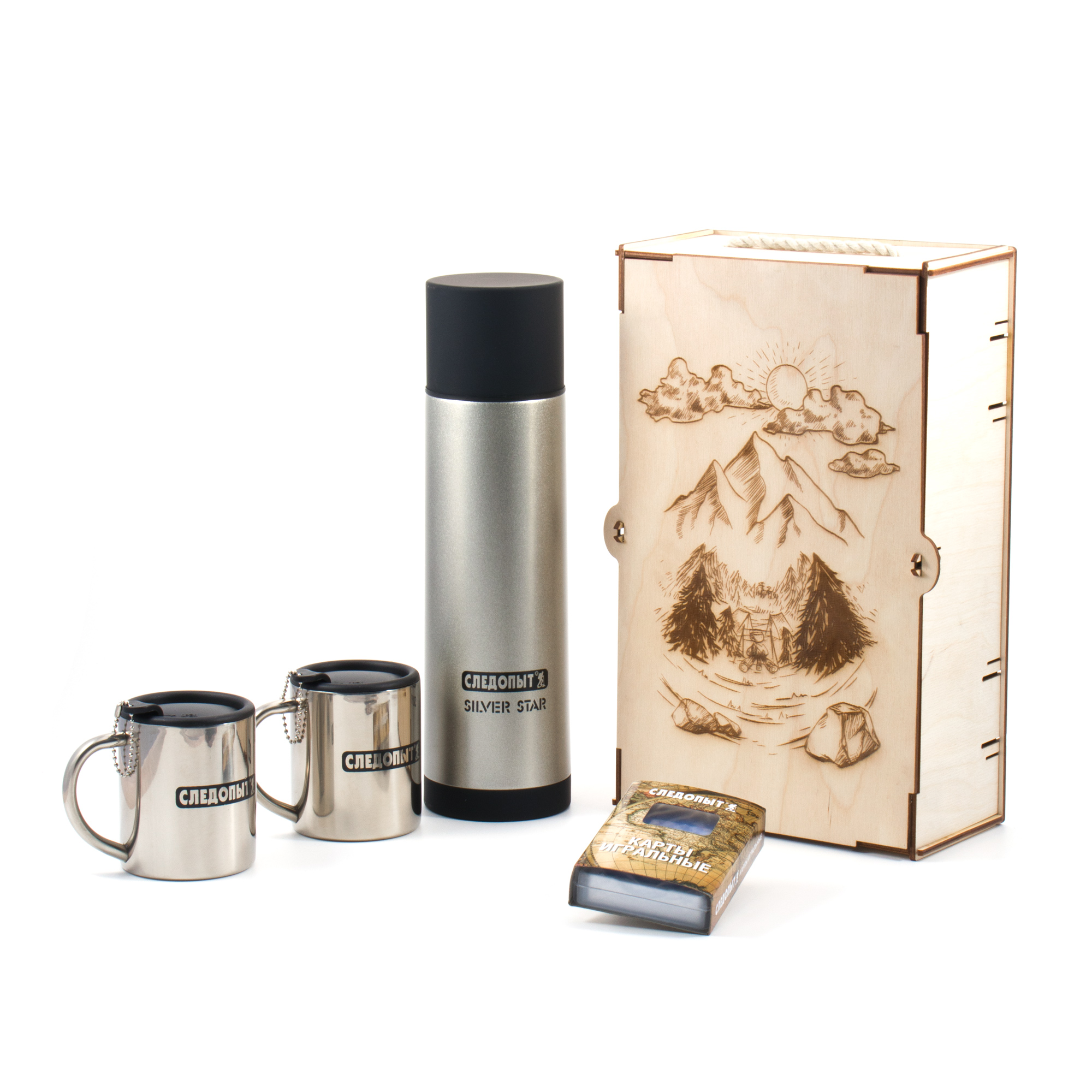 Подарочный набор "СЛЕДОПЫТ - Привал" (коробка фанерная, термос, кружка, карты игральные)
