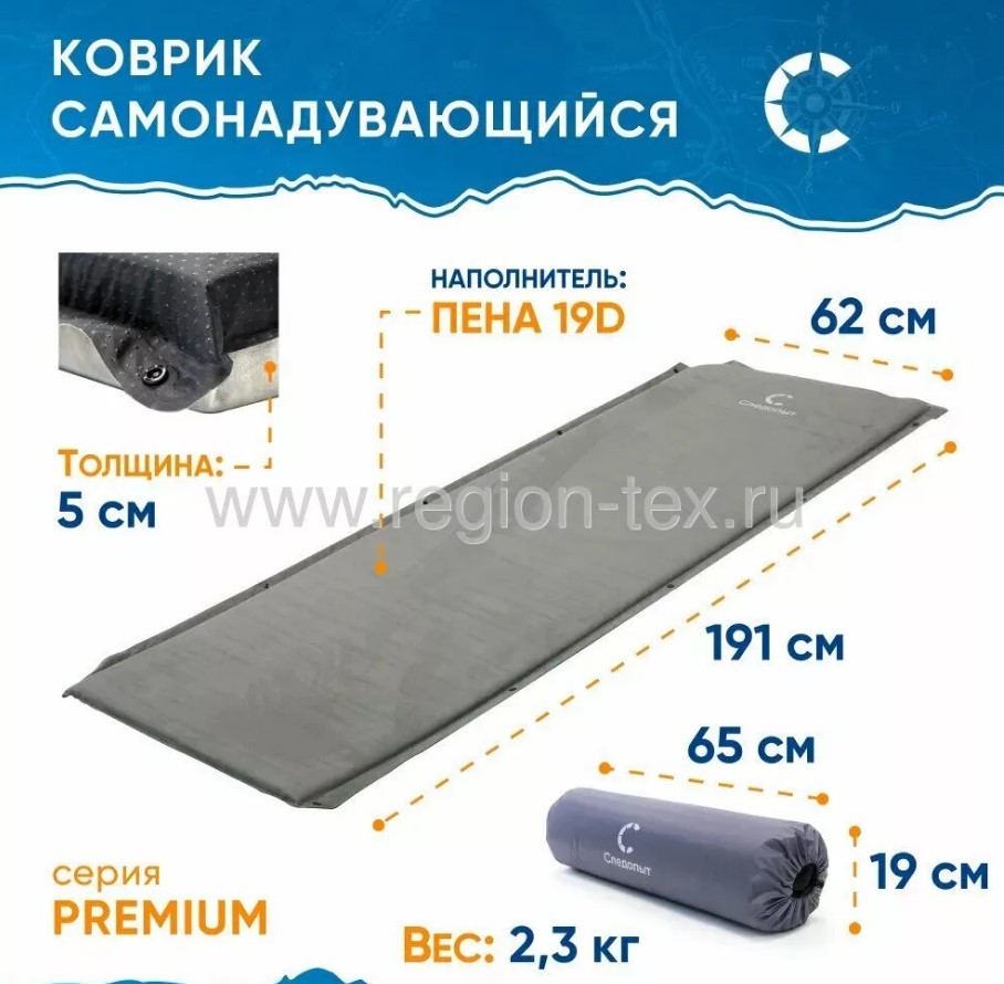 Характеристики «Коврик самонадувающийся "СЛЕДОПЫТ" 191x62x5cм, премиум, цв. серый»
