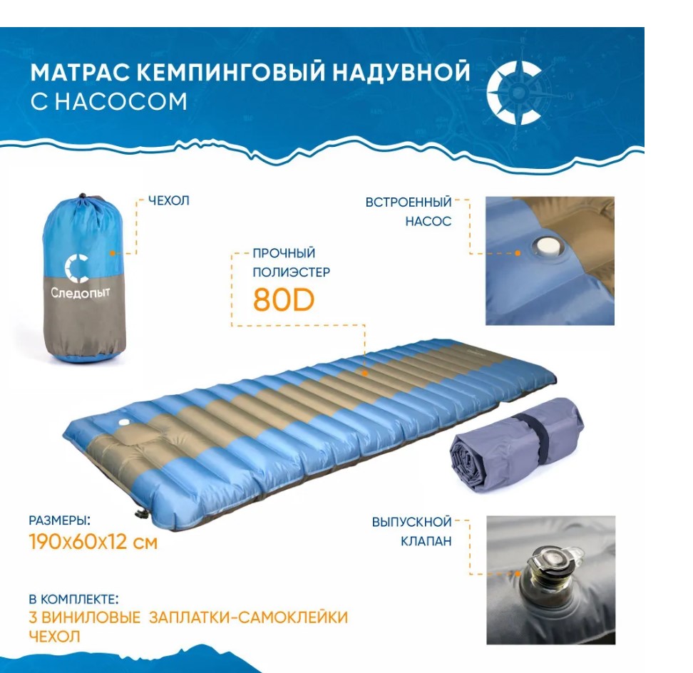 Отзывы о «Матрас кемпинговый надувной "СЛЕДОПЫТ" с насосом, 190x60x12cм, цв. голубой/серый»