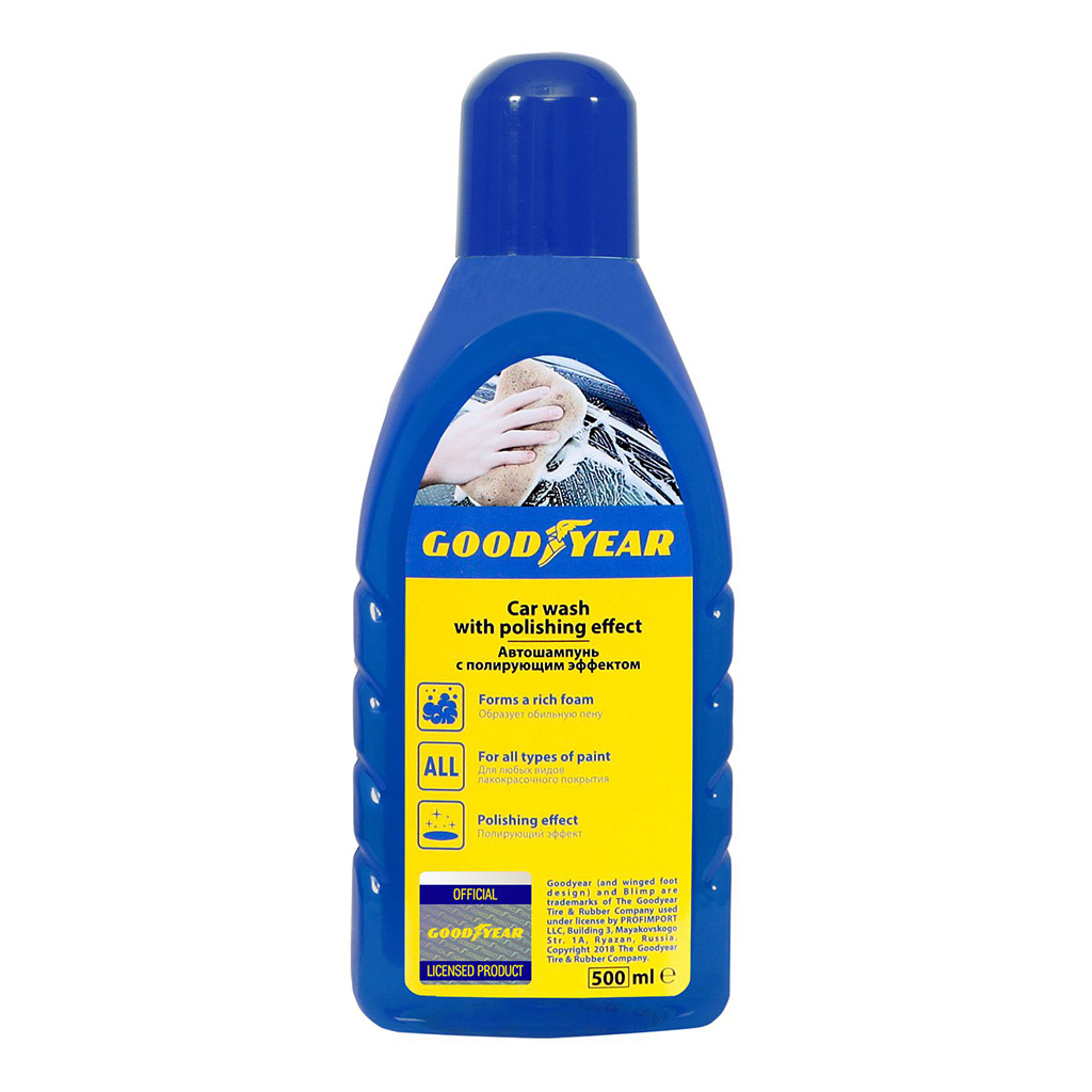 Автошампунь Goodyear с полирующим эффектом 500мл. Автошампунь с полирующим эффектом от Goodyear для ручной мойки автомобиля. Применяется для ухода за лакокрасочным покрытием и другими элементами авто. Благодаря особому концентрированному составу с высоким содержанием поверхностно-активных веществ, шампунь легко справляется с самыми стойкими загрязнениями. Средство может применяться на любых видах лакокрасочного покрытия, а также стеклянных, пластиковых и резиновых элементах машины. Автошампунь Goodyear создает обильную пену, которая покрывает всю поверхность автомобиля, легко смывается, не оставляя разводов. Полирующие компоненты, входящие в состав шампуня, создают на поверхности автомобиля защитную пленку, которая обладает грязеотталкивающим эффектом. Автомобиль остается чистым гораздо дольше. Не используйте средства на горячем автомобиле.
