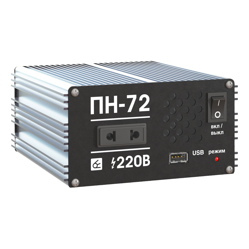 Импульсный преобразователь напряжения Вымпел ПН-72, он же инвертор, служит для преобразования напряжения 12В в эффективное напряжение 220В, чистый синус, благодаря чему от бортовой сети автомобиля можно запитать любые бытовые приборы (мобильный телефон, фен, утюг, ноутбук и т.д.)