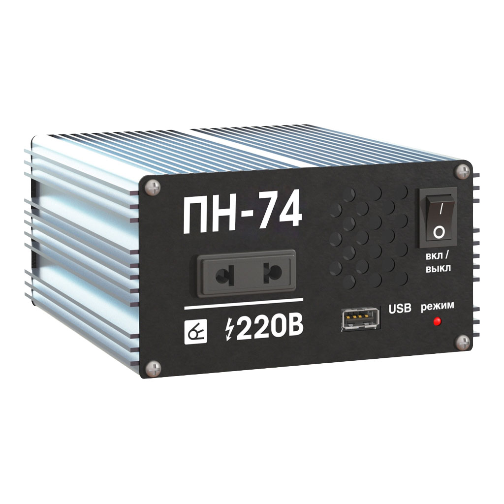 Импульсный преобразователь напряжения Вымпел ПН-74, он же инвертор, служит для преобразования напряжения 24В в эффективное напряжение 220В, чистый синус, благодаря чему от бортовой сети автомобиля можно запитать любые бытовые приборы (мобильный телефон, фен, утюг, ноутбук и т.д.)