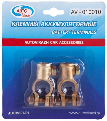 Отзывы о «Клеммы АКБ "+", "-" (латунь, прямое крепление) 2шт в блистере "AUTOVIRAZH"»