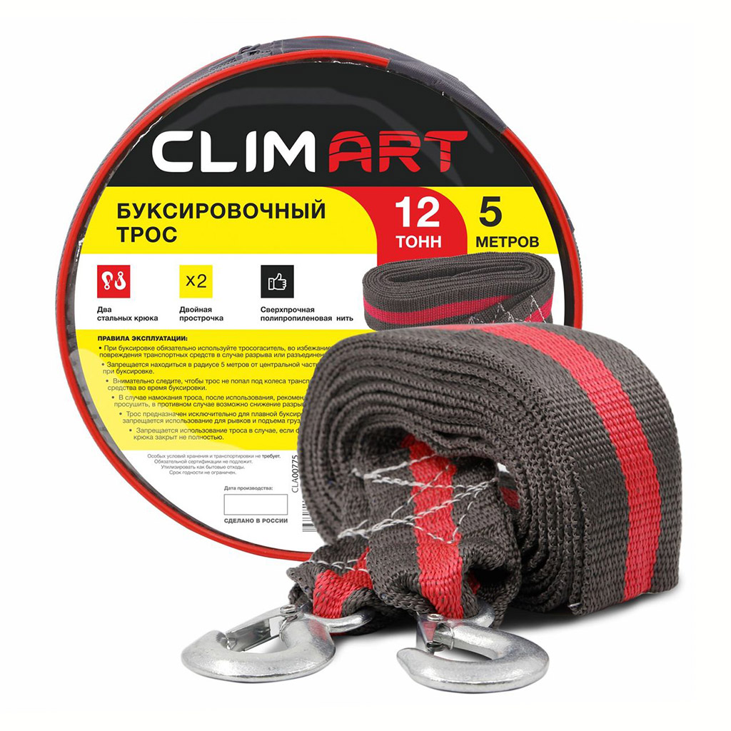 Трос для буксировки Clim Art имеет разрывную нагрузку 12 тонн и предназначен только для буксировки транспортных средств со снаряженной массой до 6 тонн, поэтому он подходит для буксировки как легковых автомобилей, так кроссоверов и внедорожников. Он станет незаменимым помощником водителя в условиях бездорожья и в аварийных ситуациях.