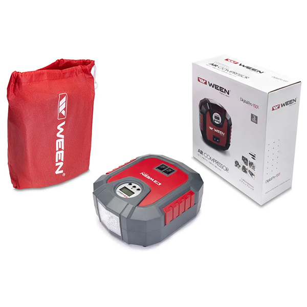 Компрессор, Digital Pro-1001, (120 W, 30L/MIN, 12 V, 10 атм. /150 PSI), цифровой манометр, LED фонарь, комплект переходников, предохранитель, сумка-мешок, (1 шт.)