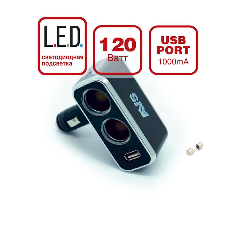 Разветвитель позволяет подключать до 3-х устройств одновременно в разъем прикуривателя через 2 разъема прикуривателя и USB порт. Крепкое надежное устройство в корпусе из огнестойкого пластика. Защита от короткого замыкания и перепадов напряжения. Работа в сетях с номинальным напряжением 12В и 24В. Универсален для любых автомобилей.