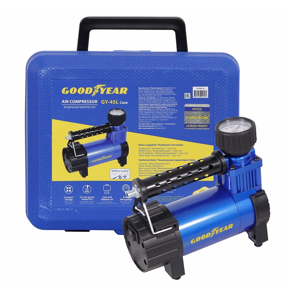 Воздушный компрессор Goodyear GY-45L CASE 45л/мин GY000116 относится к технике бытового класса. Устройство применяется для быстрого накачивания автомобильных и велосипедных шин, мячей, резиновых лодок, матрасов.
