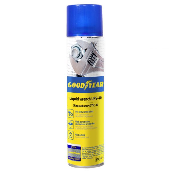 Жидкий ключ Goodyear УПС-40 аэрозоль 400 мл. Универсальное стредство У П С-40 Goodyear применяется для очищения резьбовых и других металлических соединений от ржавчины и окислившихся наростов. Позволяет вернуть подвижность металлическим соединениям различного характера. Средство является незаменимым помощником при ремонте автомобилей, в сантехнических работах, а также при обработке петель, замков и пр. Благодаря высокой растворяющей и проникающей способности, быстро устраняет заклинивание деталей и скрип соединений. Предотвращает срыв резьбы. Упаковка-аэрозоль позволяет удобно наносить средство, а благодаря наличию насадки-трубочки состав легко применять даже в труднодоступных местах. Перед применением ознакомьтесь с инструкцией на тыльной стороне упаковки. После нанесения дайте составу впитаться (15-20 мин).