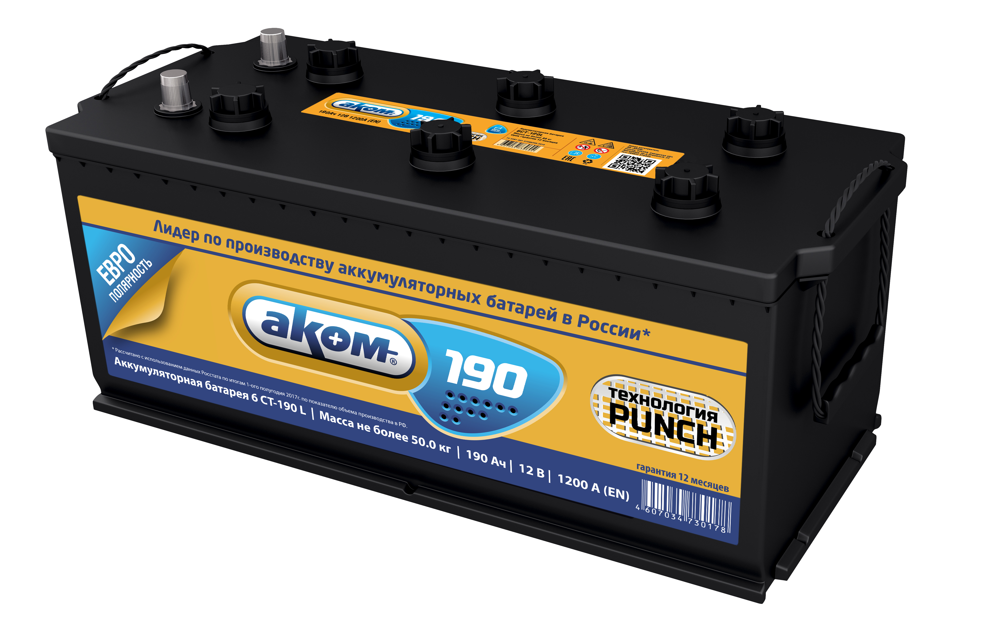 АКБ 6СТ-190.4L АКОМ (B, пуск. ток 1200, плюс справа, гарантия 12 месяцев) 2025г