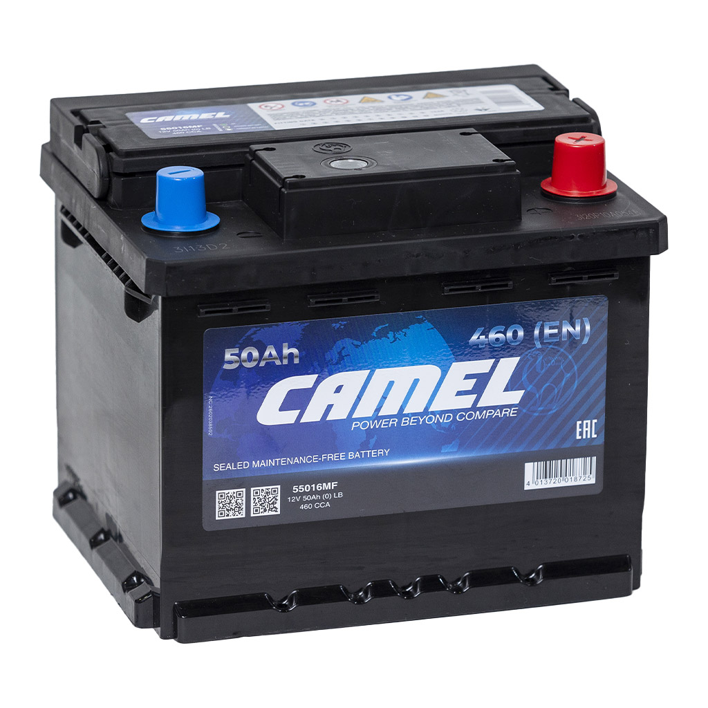 Характеристики «АКБ 6СТ-50.0 CAMEL низкий 55016MF (L1B/пуск.ток 460/плюс справа/гарантия 12 месяцев/207х175х175/Кита»
