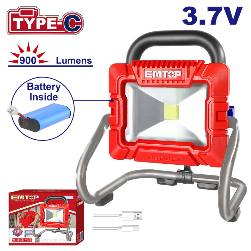 Фонарь EMTOP ELWL4415, представляет собой современный прожектор на аккумуляторе, встроенная батарея имеет возможность замены в отличии от одноразовых моделей в похожих брендах, шнур для зарядки USB Type-C в комплекте, отличное исполнение рамы и качественные материалы деталей конструкции