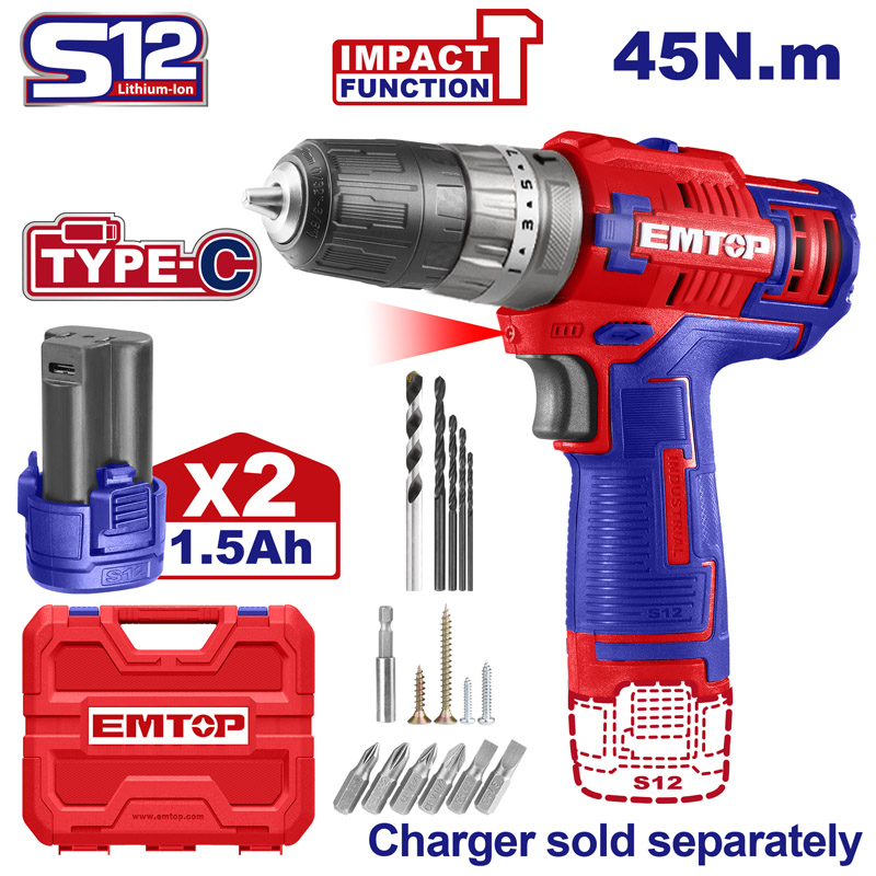 Аккумуляторная ударная дрель-шуруповерт Скорость холостого хода: 0-400 / 0-1500 об / мин Максимальная скорость удара: 22500 об / мин Макс/крут 45 Нм