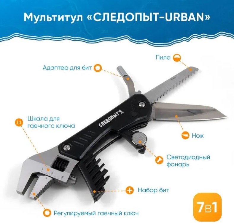 Мультитул (гаечный ключ) "СЛЕДОПЫТ-URBAN", 160х40х18мм, 7 предметов, с набором бит, в чехле, на бли