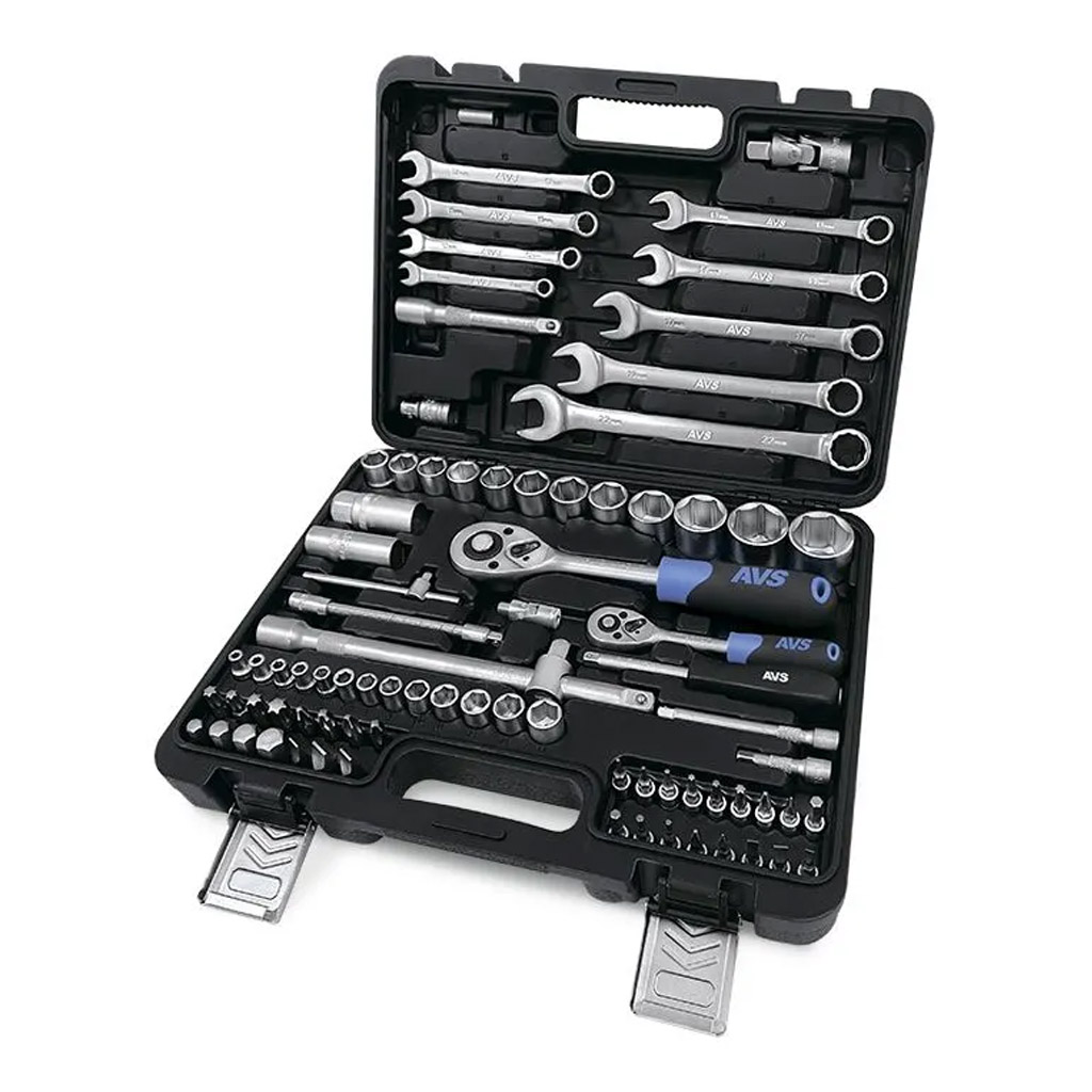 Набор инструментов AVS предназначен для ремонта и обслуживания автомобиля. Может быть использован в гараже, в мастерской или в быту. Все компоненты набора изготовлены из высокопрочной закаленной углеродистой стали, имеют матовое хромированное покрытие, благодаря чему отличаются высокой прочностью и долговечностью. Трещотки оснащены храповым механизмом на 45 зубцов и имеют двухкомпонентные эргономичные рукояти. В набор входит 82 предмета. Состав набора указан на упаковке. Прочный кейс для удобного хранения и транспортировки.