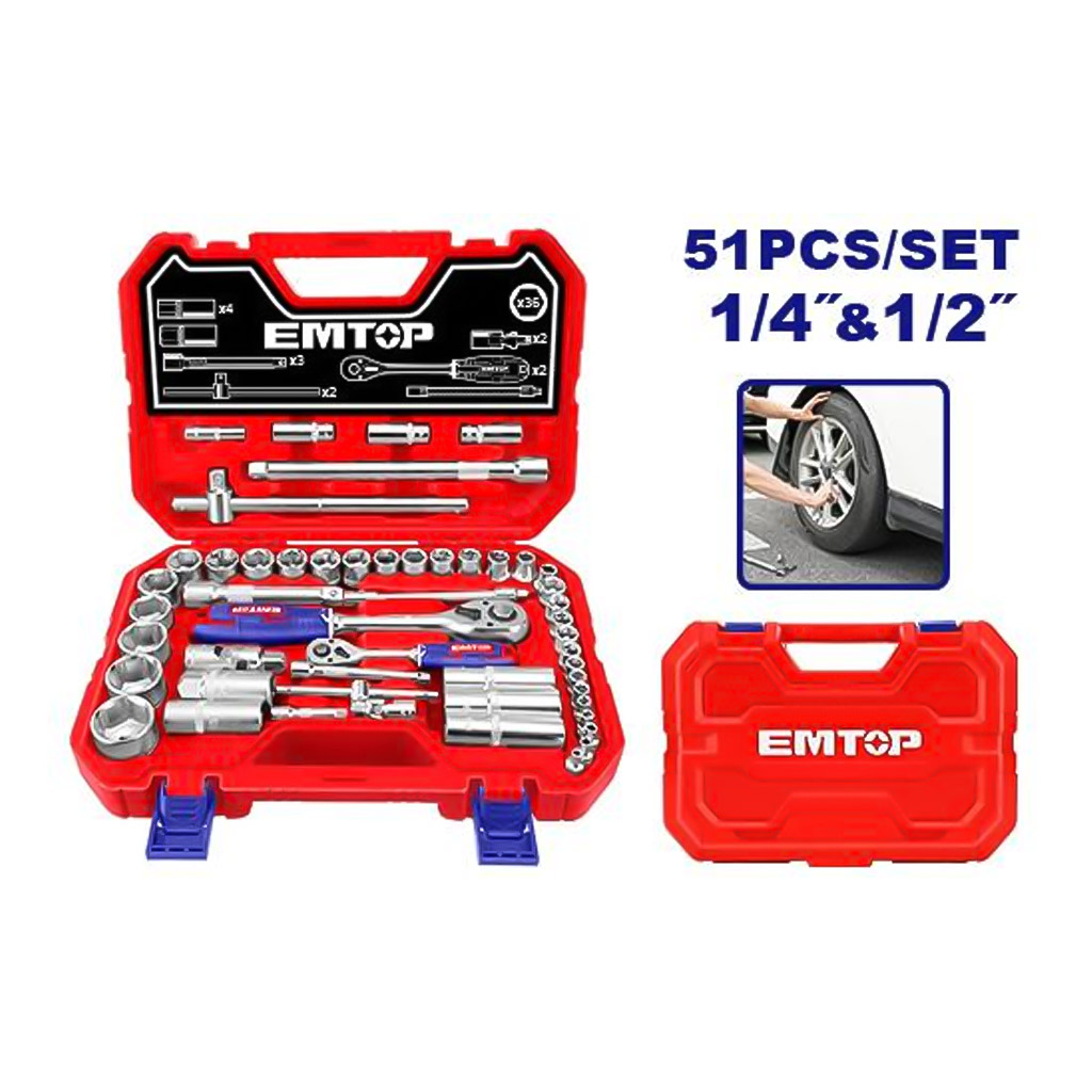 Набор инструментов EMTOP ESKT42511 51 предмет, в пластиковом кейсе с ручкой и на пластмассовых защелках, используется для ремонта и обслуживания автомобилей и прочей техники.