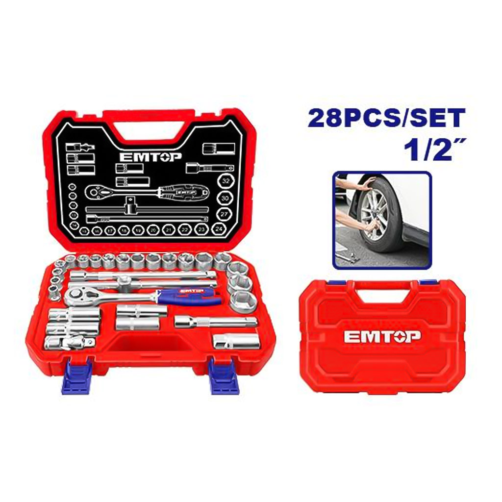 Набор головок 1/2" с трещоткой 28 предметов. EMTOP ESKT12281 используется для монтажа и демонтажа резьбовых соединений. Рабочие элементы изготовлены из высококачественной хромванадиевой стали CrV. Повышенная твердость достигается благодаря процессу холодной ковки с последующей термообработкой. Трещотка обеспечивает дополнительный комфорт в работе, так как можно не перехватывать руку во время закручивания.