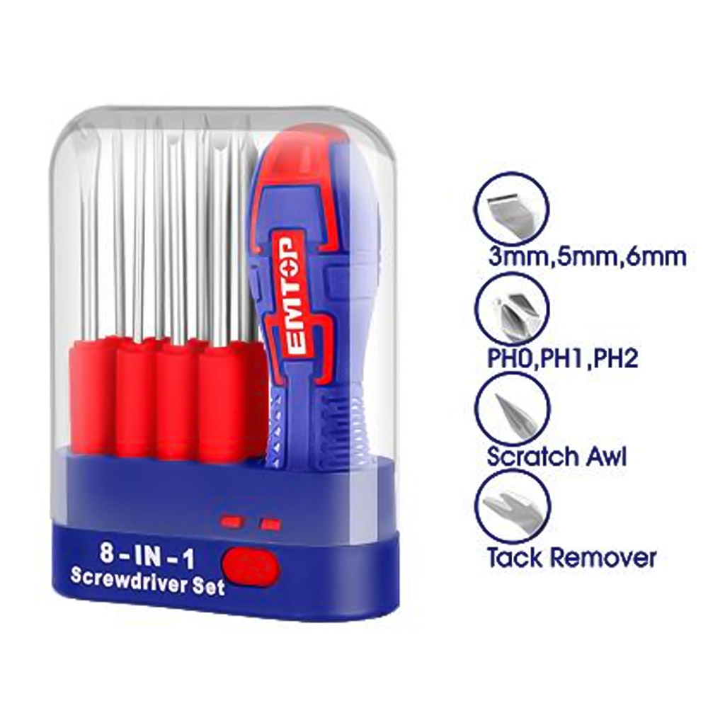 Отвертка со сменными насадками EMTOP ESDRH0902 предназначен для монтажа/демонтажа резьбовых соединений Материал: хромванадиевая сталь. Упакован в пластиковую коробку.Особенности отвертки:- 8 сменных насадок- Намагниченный наконечник- Большая прорезиненная рукоятка- Плотная установка насадок в гнезде.