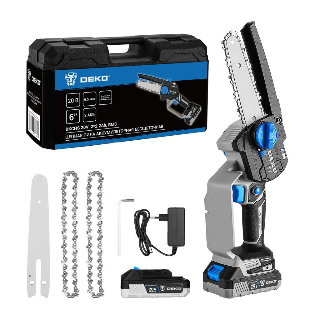 Пила цепная аккумуляторная бесщеточная DEKO DKCHS 20V, 6", 20В, 2x2.2Ач, 2 шины и 3 цепи в кейсе