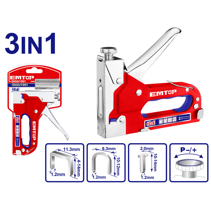 Характеристики «Степлер 3 в 1 Регулируемая сила нажатия Скобы: Проволока: 1,2 мм, головка: 11,3 мм, Длина: 4-14 мм U»