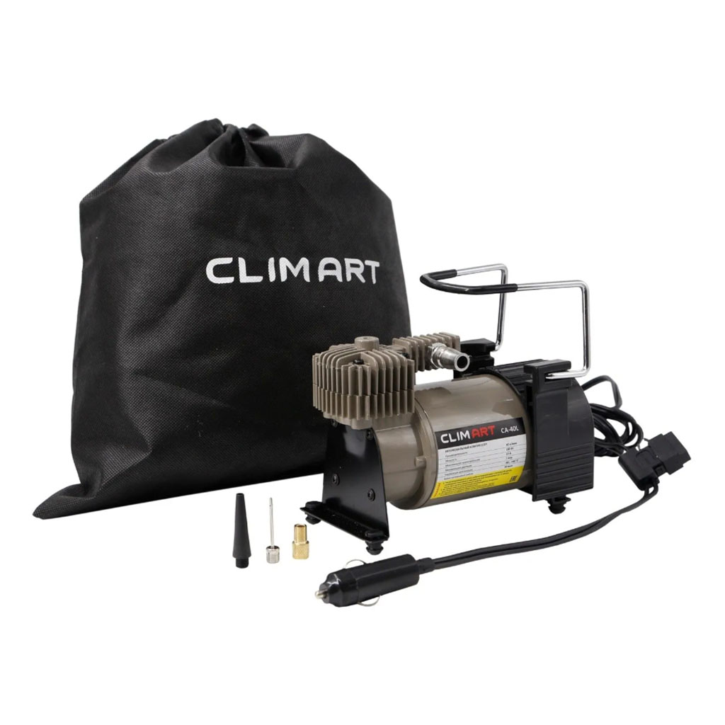 Компрессор автомобильный 40л/мин Clim Art CA-40L витой шланг сумка-мешок. Автомобильный компрессор Goodyear CA-40L предназначен для накачивания автомобильных и велосипедных шин, резиновых лодок, мячей, матрасов. Питание осуществляется через гнездо прикуривателя. Флажковый предохранитель в капсуле защищает электрическую цепь автомобиля и компрессора от скачков нарояжения. Корпус и поршневая группа компрессора сделаны из металла.В комплект входит набор насадок-переходников, прочная сумка из износостойкого материала.