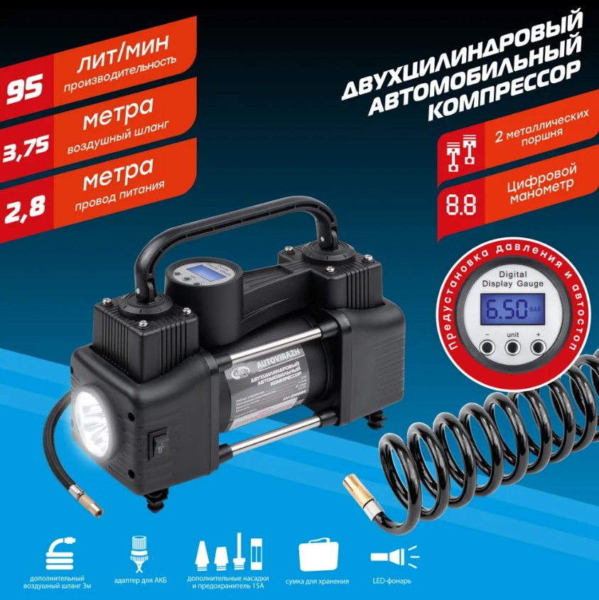 Компрессор двухцилиндровый 95 л/мин с цифр. маном., функц автостоп, пневм. шланг "AUTOVIRAZH"