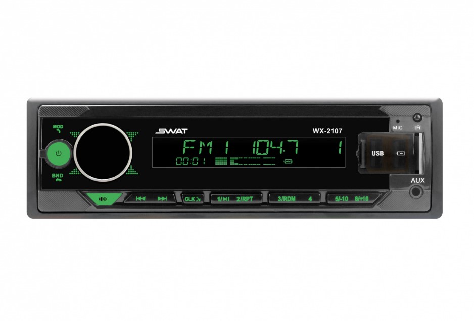 Автомобильная магнитола SWAT WX-2107 оснащена цветным дисплеем с кнопками и многоцветной подсветкой. На передней панели есть разъемы трансляции музыки с внешних накопителей. Модель дополнена Bluetooth для беспроводного подключения мобильных устройств с поддержкой функции телефонных разговоров по громкой связи.