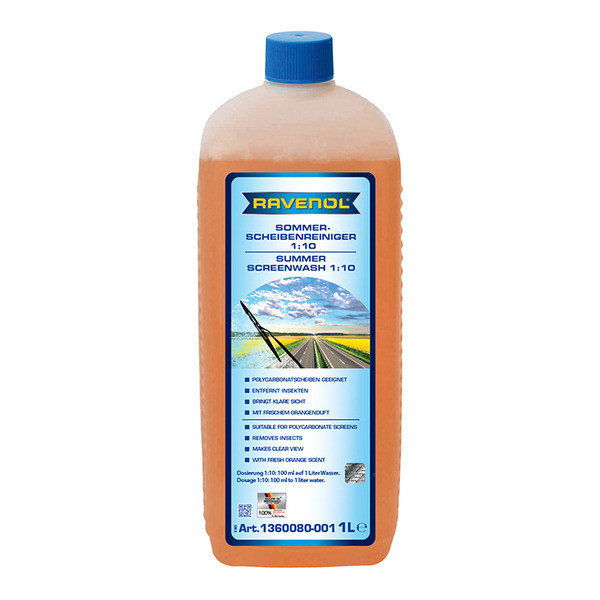 RAVENOL Sommer-Scheibenreiniger 1: 10 концентрат летней стеклоомывающей жидкости для бачка стеклоомывателя автомобиля с запахом апельсина. Разработана для стеклоомывателей современных автомобилей всех марок.