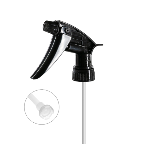 Распрыскиватель с уплотнениями из химически стойкой резины предназначен для накручивания на стандартную емкость 750 мл продукции Shine Systems и любую другую емкость с резьбой на горловине 28/400-410. Триггер подходит для работы с различными типами химии – щелочами, кислотами, сольвентами. Успешно прошел проверку всеми составами Shine Systems. За одно нажатие на курок прокачивает 1-1,2 мл состава. Длина всасывающей трубки 27 см.