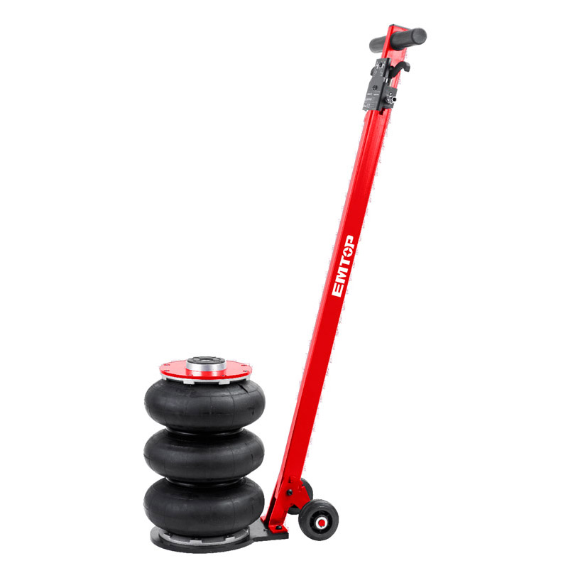 Профессиональный 3-камерный пневматический домкрат позволяет производить быстрый демонтаж и установку колес легковых автомобилей, а также необходимый местный ремонт подвески, узлов рулевого управления и тормозной системы. Домкрат подкатной, рассчитан на подключение к компрессору, подающему сжатый воздух. Устройство приводится в действие путем открытия крана подачи, расположенного на конце управляющей рукоятки. Конструкция данной модели включает три распорные резиновые подушки.