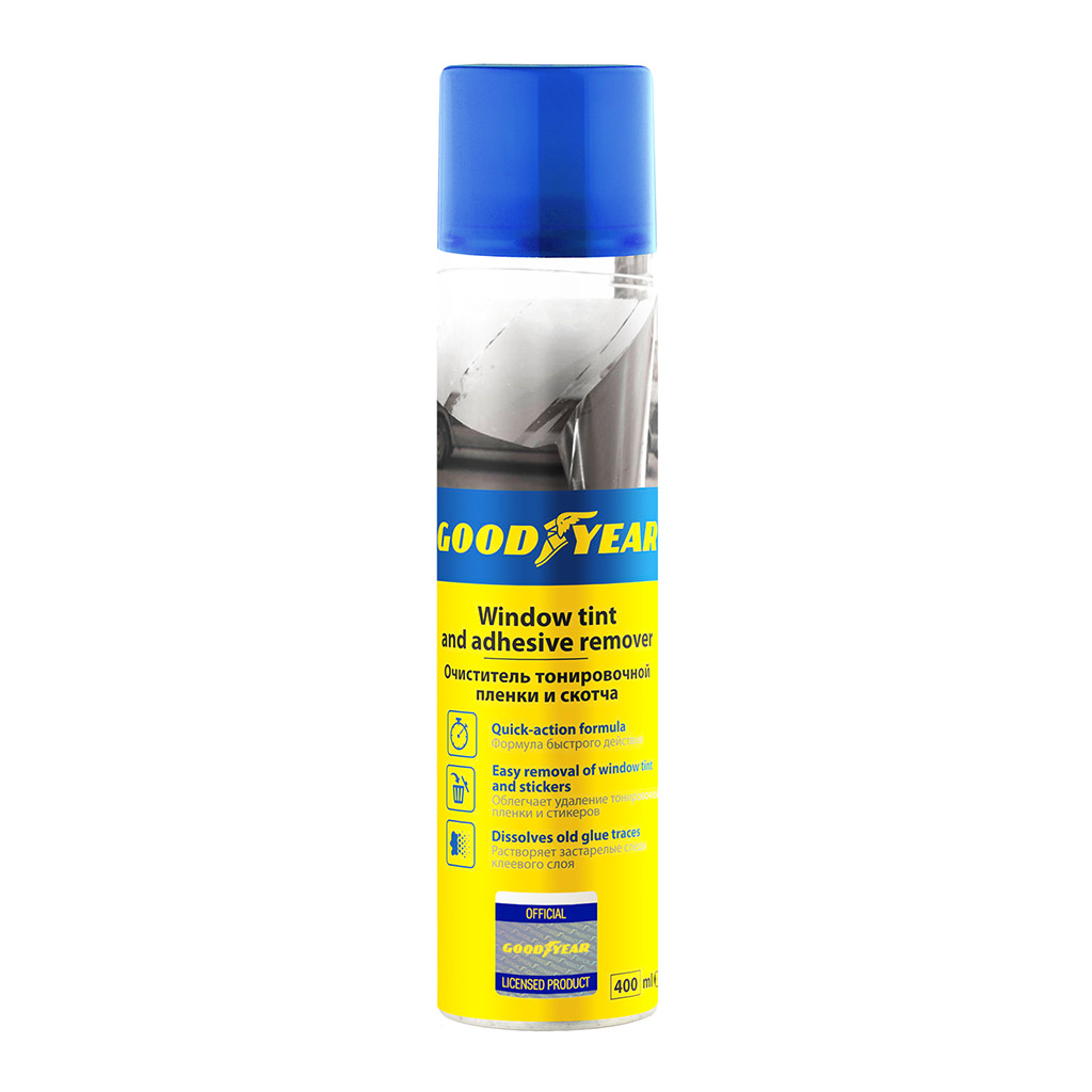 Очиститель тонировочной пленки и скотча от Goodyear предназначен для удаления следов клея, наклеек, скотча и тонировочной пленки со стеклянных, металлических, пластиковых, керамических, окрашенных поверхностей. Антискотч быстро размягчает даже застарелые следы клея и может использоваться для снятия наклеек с мебели, бытовой техники и домашней утвари. Упаковка-аэрозоль позволяет равномерно наносить очиститель на поверхность. Средство для удаления скотча, наклеек подходит для наружных и внутренних работ. Перед применением ознакомьтесь с инструкцией на тыльной стороне упаковки очистителя. Формула быстрого действия. Облегчает удаление тонировочной пленки и стикеров. Растворяет застарелые следы клея. Предостережение: Огнеопасно! Баллон под давлением. Не курить во время использования. Обязательно использование СИЗ органов зрения , кожи рук и спецодежды. Предохранять от ударов, попадания прямых солнечных лучей и нагревания свыше 50 С. Не вскрывать и не сжигать даже после использования.