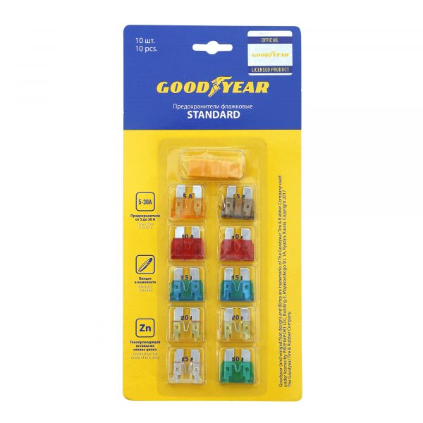 Набор флажковых предохранителей Goodyear Standart 10 шт. (GY003052) предназначен для защиты транспортных средств и электрооборудования от перегрева и короткого замыкания. Точность срабатывания в рабочем процессе обеспечивается благодаря изолирующему материалу корпуса и вставке из цинкового сплава. С помощью специального пинцета можно удалить вышедший из строя элемент. Для определения перегоревшего предохранителя достаточно посмотреть на разрыв нити внутри корпуса. Набор подходит для автомобилей всех известных марок. Благодаря блистерной упаковке, маркированной с тыльной стороны, необходимые предохранители удобно извлекать, не вскрывая при этом остальные ячейки.