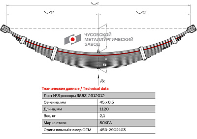 Характеристики «Лист №3 передней/задней рессоры с чашками УАЗ 2206, 3303, 3909 (1120*45*6,5)»